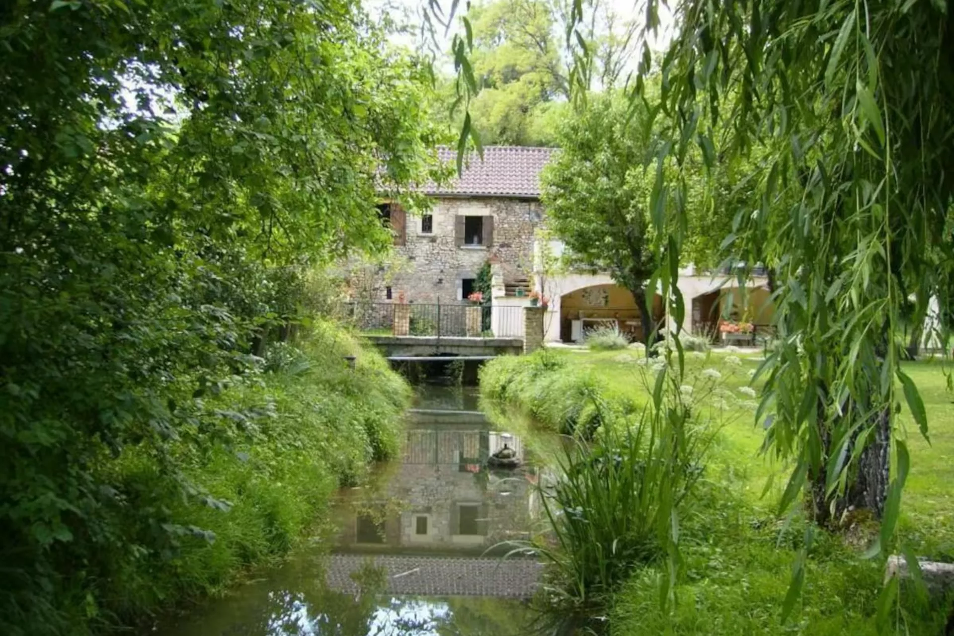 Étant un ancien moulin à eau, il y a un cours d'eau qui coule sous le moulin et dans le jardin.
