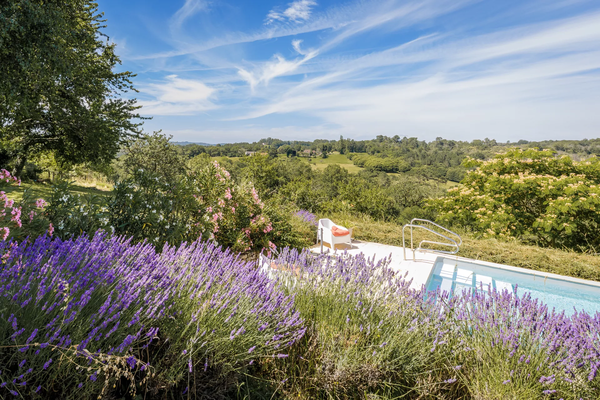 Het zuidelijk gelegen zwembad van 5 x 12 meter met zoutfiltering heeft een alarmsysteem voor extra veiligheid. Rondom ligt een riant terras van 80 m² waar je van ’s ochtends vroeg tot ’s avonds laat van de zon kunt genieten. Met uitzicht waar je stil van wordt...
